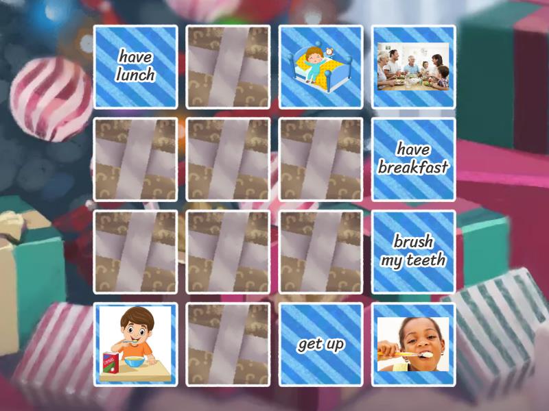 get up, have breakfast, brush my teeth, have lunch, go home, watch TV, do my homework, go to bed,