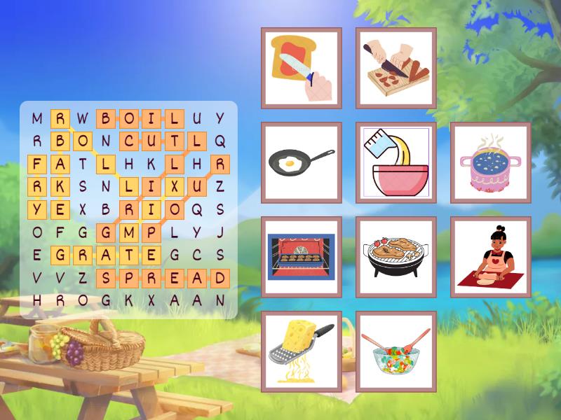 mix, pour, roll, spread, grate, cut, bake, boil, fry, grill,