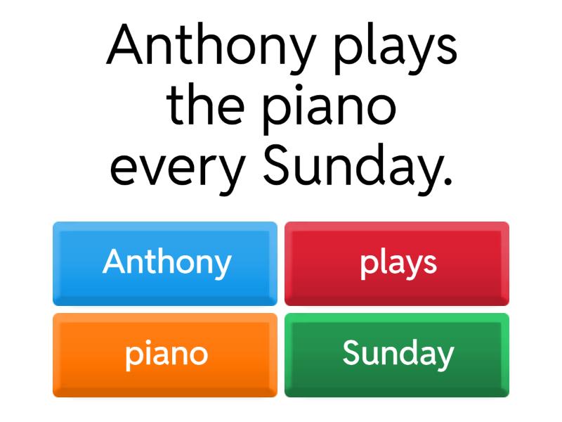 1) Anthony plays the piano every Sunday. a) Anthony b) plays c) piano d) Sunday 2) My mom makes the best chocolate cake during the holidays. a) My b) mom c) makes d) chocolate cake e) best f) holidays 3) The teacher reads a book to her class. a) book b) teacher c) reads d) a e) class 4) The students write their answers on the whiteboard. a) whiteboard  b) students c) write d) their e) answers 5) Felix rides his bike everyday after school. a) Felix b) rides c) school d) bike e) everyday 6) In the afternoon, Rosie smells the bright yellow flowers. a) yellow b) flowers c) afternoon d) smells 7) Mark and Laura finished their meal late last night. a) meal  b) night c) Laura d) finished e) their 8) The dog chased the squirrel around the tree. a) tree  b) dog c) chased d) the e) squirrel 9) In the morning, dad makes the bed very neatly. a) In b) neatly c) the bed d) dad e) makes f) morning 10) The principal drove his car to work. a) The b) principal c) drove d) car e) to f) work 11) The hardworking janitor swept the tile floor. a) floor b) janitor c) swept d) the e) hard-working 12) The boy drank some water from the water fountain. a) fountain b) boy c) drank d) water e) some