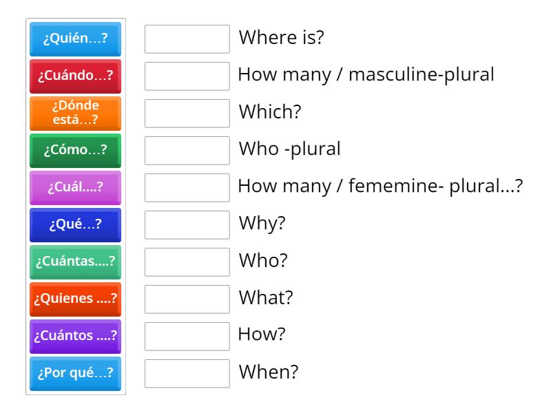 ¿Quién…? - Who?, ¿Cuándo…? - When?, ¿Qué…? - What?, ¿Dónde está…? - Where is?, ¿Por qué…? - Why?, ¿Cuál....? - Which?, ¿Cómo…? - How?, ¿Quienes ....? - Who -plural, ¿Cuántas....? - How many / fememine- plural...?, ¿Cuántos ....? - How many / masculine-plural,