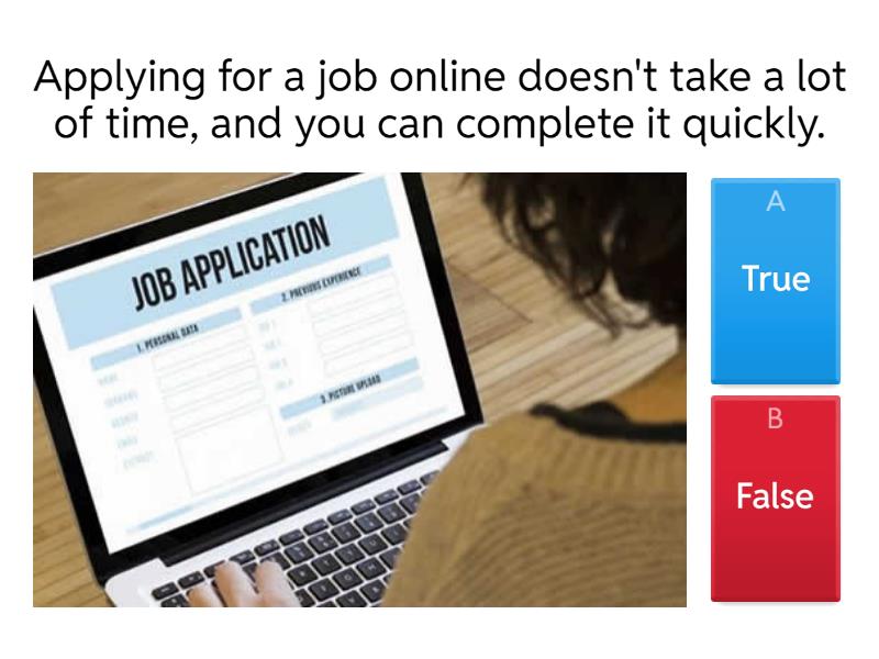 1) Applying for a job online doesn't take a lot of time, and you can complete it quickly. a) True b) False 2) Which of the following is NOT required information on an application? a) Your name b) Social Security number (SSN) c) Past work, school, or volunteer experiences d) Your TikTok username 3) Who can you ask for your Social Security number (SSN) if you don't know it? a) Pre-ETS instructors b) My teachers c) My parents/guardians 4) It's okay to use a silly email address like MaxSuperCoolSkiDude800@yahoo.com on my application. a) True b) False 5) What are some examples of things you can put as past work, school, or volunteer activities? a) School store b) Special Olympics c) Babysitting or pet sitting d) Market Basket e) History class 6) It doesn't matter who you put down as a reference. They don't check them, anyway. a) True b) False 7) Just like in school, spelling, grammar and punctuation matter on a job application. a) True b) False 8) If I want to work 15 hours a week, I need to check off "full time." a) True b) False