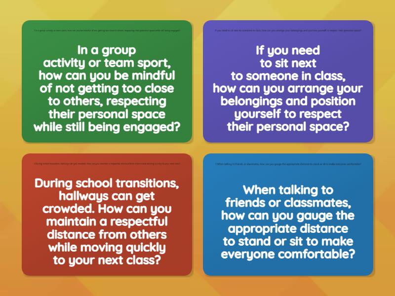 During school transitions, hallways can get crowded. How can you maintain a respectful distance from others while moving quickly to your next class?, When talking to friends or classmates, how can you gauge the appropriate distance to stand or sit to make everyone comfortable?, In a group activity or team sport, how can you be mindful of not getting too close to others, respecting their personal space while still being engaged?, If you need to sit next to someone in class, how can you arrange your belongings and position yourself to respect their personal space?,