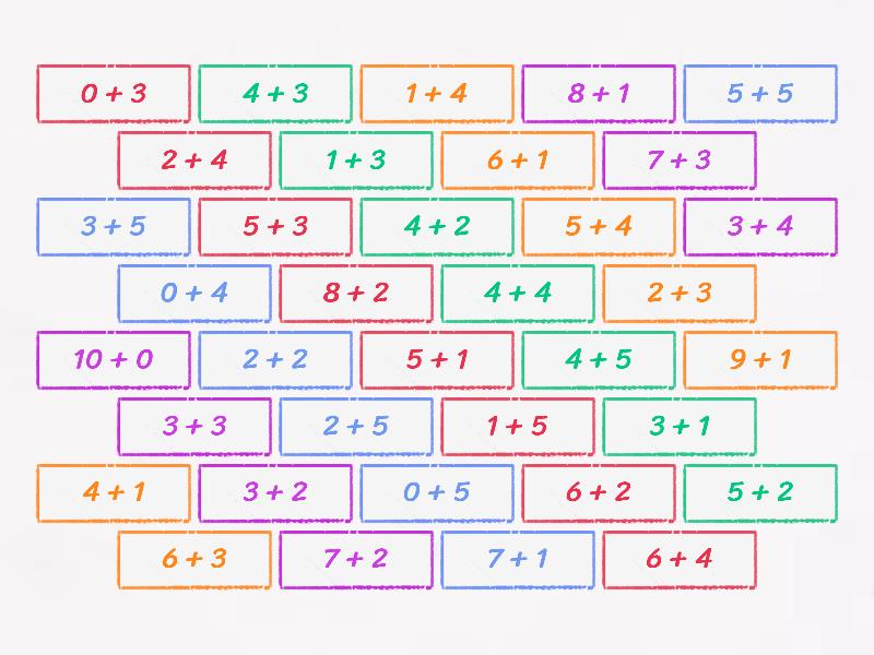 10 + 0 - 10, 9 + 1 - 10, 8 + 1 - 9, 7 + 1 - 8, 6 + 1 - 7, 5 + 1 - 6, 4 + 1 - 5, 3 + 1 - 4, 8 + 2 - 10, 7 + 2 - 9, 6 + 2 - 8, 5 + 2 - 7, 4 + 2 - 6, 3 + 2 - 5, 2 + 2 - 4, 7 + 3 - 10, 6 + 3 - 9, 5 + 3 - 8, 4 + 3 - 7, 3 + 3 - 6, 2 + 3 - 5, 1 + 3 - 4, 6 + 4 - 10, 5 + 4 - 9, 4 + 4 - 8, 3 + 4 - 7, 2 + 4 - 6, 1 + 4 - 5, 5 + 5 - 10, 4 + 5 - 9, 3 + 5 - 8, 2 + 5 - 7, 1 + 5 - 6, 0 + 5 - 5, 0 + 4 - 4, 0 + 3 - 3,