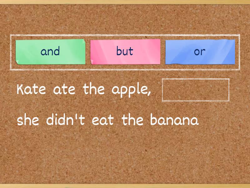 Kate ate the apple, ____ she didn't eat the banana They went to the school ____ they learned math. I study at home ____ in the library. He did his homework ____ he watched TV. She works at the store, ____ she doesn't handle money. I can eat a sandwich ____ eat a taco. He cut the trees, ____ he didn't cut the roses. He works in a hospital ____ he helps patients. She closed the door, ____ she didn't close the windows. Tomorrow I will go to KFC ____ I will go to McDonalds.