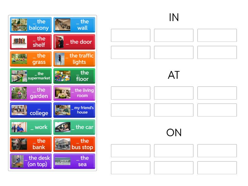 IN: _ the living room, _ the supermarket, _ the car, _ the sea, _ the bank, _ the garden, AT: _ the traffic lights, _ work, _ the bus stop, _ the door, _ my friend's house, _ college, ON: _ the desk (on top), _ the balcony, _ the floor, _ the shelf, _ the grass, _ the wall,
