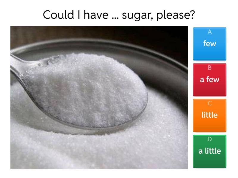 1) Could I have ... sugar, please? a) few b) a few c) little d) a little 2) There will be ... rain this week. a) few b) a few c) little d) a little 3) Andrew is too reserved. So he has … friends. a) few b) a few c) little d) a little 4) I'm exhausted. I need ... sleep. a) few b) a few c) little d) a little 5) There's ... petrol in the car. We have to fill some fuel. a) few b) a few c) little d) a little 6) Cindy is upset. She has very ... flowers. a) few b) a few c) little d) a little 7) We have... eggs in the fridge. How about an omelette? a) few b) a few c) little d) a little 8) I have ... books for my dissertation. I need to go to the local library a) few b) a few c) little d) a little 9) Though the local library is not big and modern, I managed to find ... books for my dissertation. a) a little b) little c) a few d) few 10) I have ... money. I even can’t afford this dress a) a little b) little c) few d) a few 11) If I had ... money, I would get this dress a) a little b) little c) few d) a few 12) I have only ... minutes, I should hurry not to miss the bus a) few b) a few c) little d) a little 13) I’ve got only ... sugar so I can’t make this wonderful cake a) few b) a few c) a little d) little