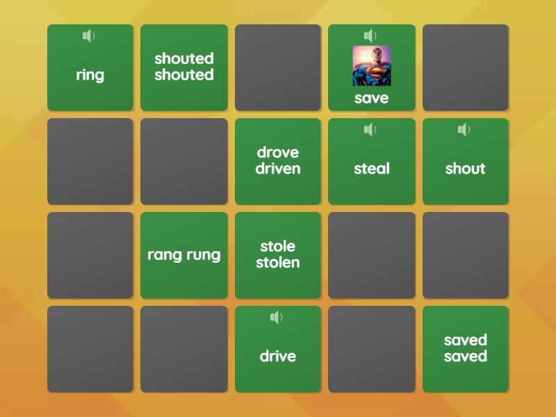 drive - drove driven, steal - stole stolen, save - saved saved, shout - shouted shouted, ring - rang rung, greet - greeted greeted, welcome - welcomed welcomed, keep - kept kept, help - helped helped, burst - burst burst,