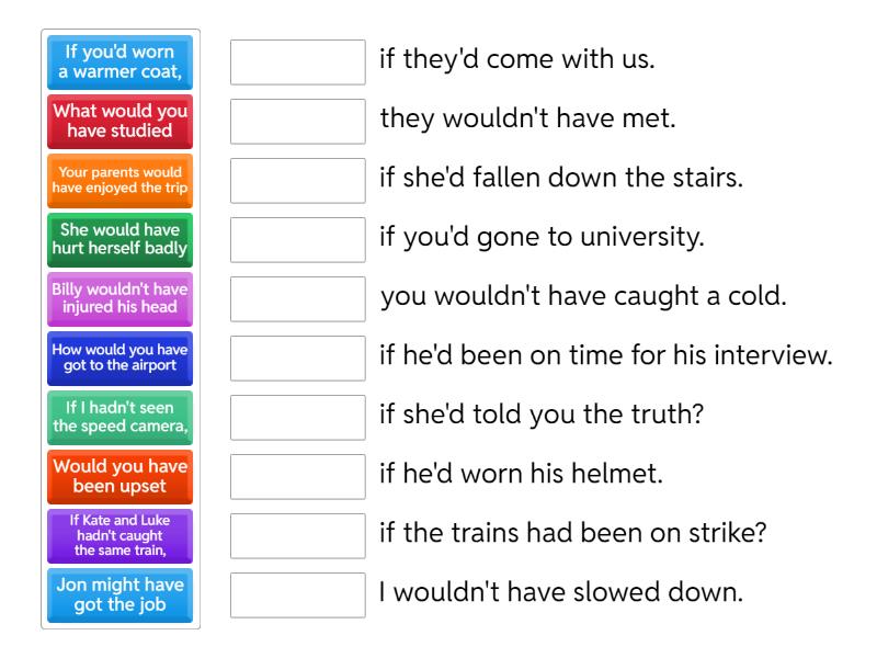 Billy wouldn't have injured his head - if he'd worn his helmet. , If I hadn't seen the speed camera, - I wouldn't have slowed down. , Jon might have got the job - if he'd been on time for his interview. , She would have hurt herself badly - if she'd fallen down the stairs. , If Kate and Luke hadn't caught the same train, - they wouldn't have met. , What would you have studied - if you'd gone to university. , How would you have got to the airport - if the trains had been on strike?, If you'd worn a warmer coat, - you wouldn't have caught a cold. , Your parents would have enjoyed the trip - if they'd come with us. , Would you have been upset - if she'd told you the truth?,