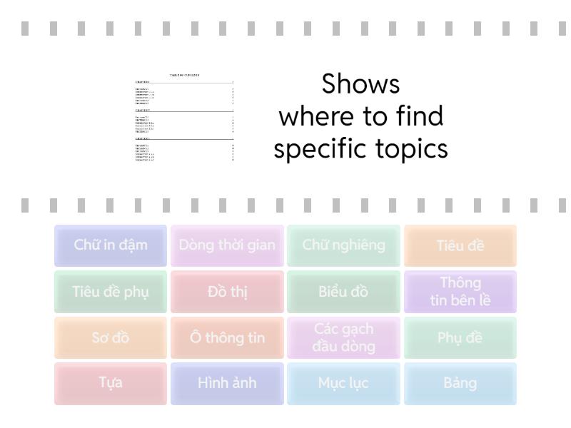 Mục lục - Shows where to find specific topics, Tựa - Gives readers a clear idea of the main topic or focus of the text., Tiêu đề - Indicate the main idea Level 1 of sections, Tiêu đề phụ - Indicate the main idea Level 2 of sections, Các gạch đầu dòng - Break information into smaller, clear parts, Hình ảnh - Provide a visual representation, Phụ đề - Explain what an image or diagram shows., Ô thông tin - Summarize key points or provide quick tips., Thông tin bên lề - Provide extra facts or related information, Bảng - (Table) Summarize data in a reader-friendly format, Đồ thị - (Graph) Present data relationships in a visual format., Sơ đồ - Visualize relationships or steps, Biểu đồ - Visualize relationships, Dòng thời gian - Show events in chronological order., Chữ in đậm - (Bold) Draw attention to important terms or ideas., Chữ nghiêng - (Italics) Draw attention to important terms or ideas.,