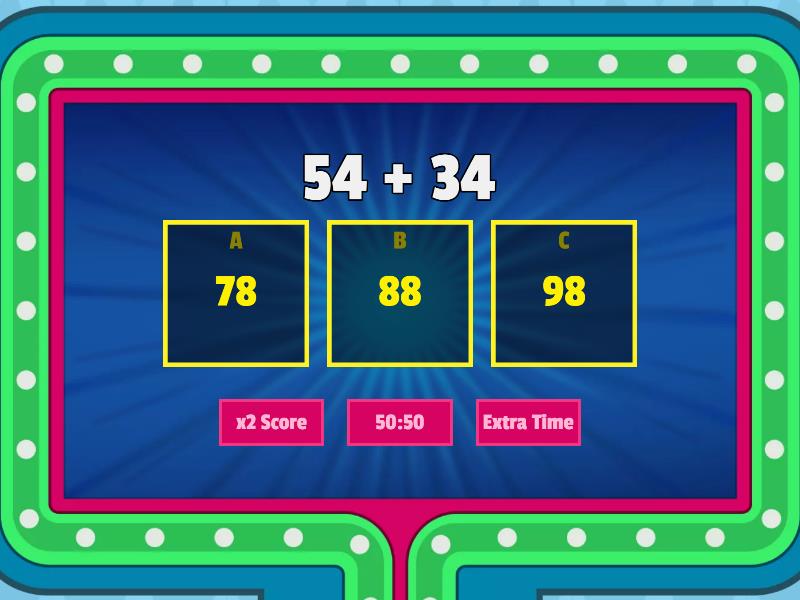 1) 54 + 34 a) 78 b) 88 c) 98 2) 64 + 21 a) 80 b) 85 c) 95 3) 37 + 22 a) 59 b) 49 c) 69 4) 82 + 15 a) 87 b) 96 c) 97 5) 42 + 51 a) 39 b) 93 c) 99 6) 44 + 44 a) 80 b) 88 c) 84 7) 23 + 66 a) 86 b) 88 c) 89 8) 57 + 21 a) 58 b) 68 c) 78 9) 87 + 12 a) 75 b) 97 c) 99 10) 12 + 65 a) 77 b) 68 c) 79 11) 17 + 52 a) 69 b) 68 c) 67 12) 33 + 15 a) 68 b) 58 c) 48 13) 56 + 23 a) 79 b) 78 c) 89 14) 72 + 25 a) 99 b) 97 c) 95 15) 64 + 25 a) 87 b) 88 c) 89 16) 78 + 11 a) 99 b) 98 c) 89 17) 25 + 24 a) 49 b) 45 c) 41 18) 31 + 38 a) 68 b) 69 c) 58 19) 54 + 45 a) 99 b) 100 c) 98 20) 76 + 23 a) 95 b) 89 c) 99