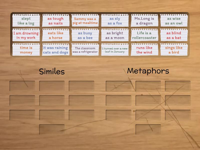 Similes: as busy as a bee, as bright as a moon, as sly as a fox, slept like a log, eats like a horse, sings like a bird, as blind as a bat, as wise as an owl, runs like the wind, as tough as nails, Metaphors: The classroom was a refrigerator, I turned over a new leaf in January, Life is a rollercoaster, Ms.Long is a dragon, I am drowning in my work, Sammy was a pig at mealtime, it was raining cats and dogs, time is money,