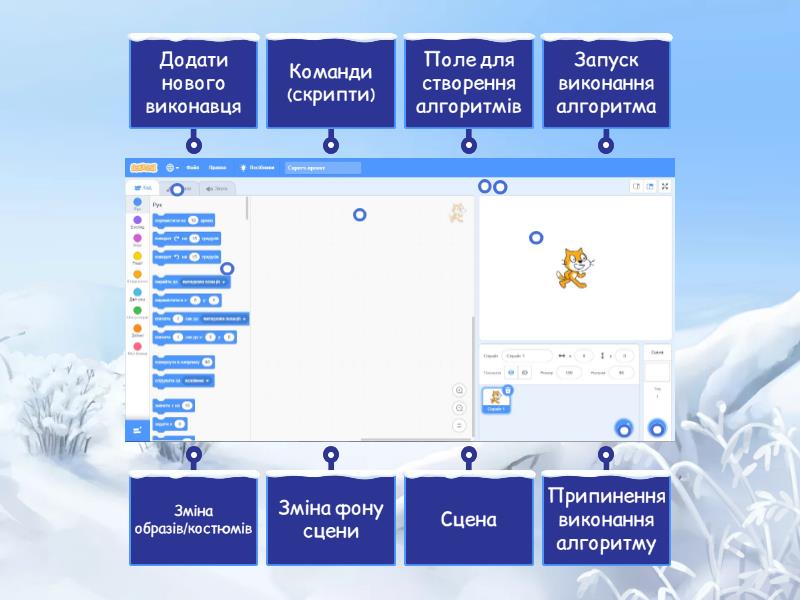 Сцена, Команди (скрипти), Зміна образів/костюмів, Поле для створення алгоритмів, Запуск виконання алгоритма, Припинення виконання алгоритму, Додати нового виконавця, Зміна фону сцени.