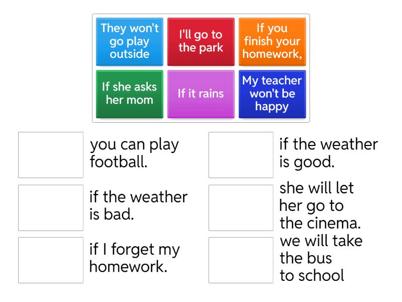 I'll go to the park - if the weather is good., If you finish your homework, - you can play football., They won't go play outside - if the weather is bad., If it rains - we will take the bus to school, My teacher won't be happy - if I forget my homework., If she asks her mom - she will let her go to the cinema.,