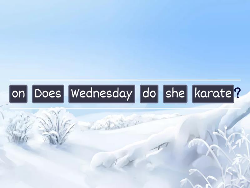 Do you do your homework on Saturday?, Does she snowboard in December?, Does he watch TV in the evening?, Do you read at night?, Do you have breakfast in the morning?, Do your mum and dad get up at 7 o'clock?, Does she go to school on Monday?, Does he play basketball on Tuesday?, Does she do karate on Wednesday?, Does he roller skate on Saturday?,
