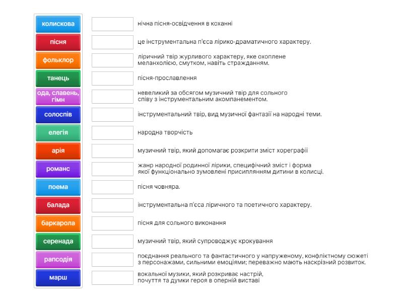 романс - невеликий за обсягом музичний твір для сольного співу з інструментальним акомпанементом., ода, славень, гімн - пісня-прославлення, баркарола - пісня човняра., серенада - нічна пісня-освідчення в коханні, арія - вокальної музики, який розкриває настрій, почуття та думки героя в оперній виставі, елегія - ліричний твір журливого характеру, яке охоплене меланхолією, смутком, навіть стражданням., поема - це інструментальна п'єса лірико-драматичного характеру., рапсодія - інструментальний твір, вид музичної фантазії на народні теми., балада - поєднання реального та фантастичного у напруженому, конфліктному сюжеті з персонажами, сильними емоціями; переважно мають наскрізний розвиток., колискова - жанр народної родинної лірики, специфічний зміст і форма якої функціонально зумовлені присиплянням дитини в колисці., солоспів - пісня для сольного виконання, марш - музичний твір, який супроводжує крокування, танець - музичний твір, який допомагає розкрити зміст хореграфії, пісня - інструментальна п'єса ліричного та поетичного характеру., фольклор - народна творчість,