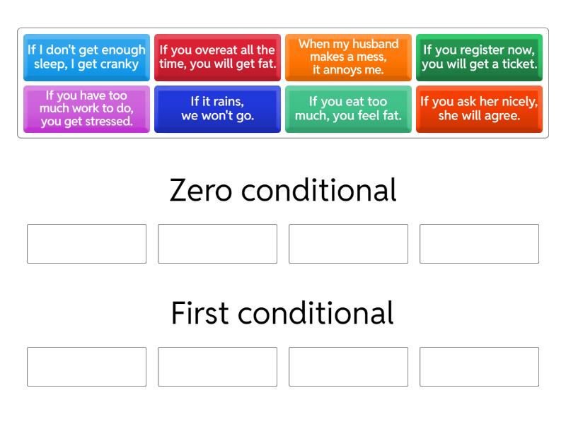 Zero conditional : When my husband makes a mess, it annoys me. , If you have too much work to do, you get stressed. , If I don't get enough sleep, I get cranky , If you eat too much, you feel fat. , First conditional : If you overeat all the time, you will get fat. , If you register now, you will get a ticket. , If you ask her nicely, she will agree. , If it rains, we won't go. ,