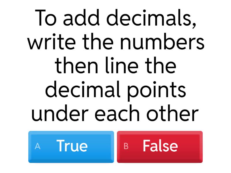 1) To add decimals, write the numbers then line the decimal points under each other a) True b) False 2) To subtract decimals, write the numbers vertically. The decimal points do not need to line up. a) True b) False 3) To multiply decimals, write the numbers vertically. The decimal points do not need to line up. a) True b) False 4) When adding fractions, the denominators need to be the same numerical value. a) True b) False 5) When multiplying fractions, the denominators do not need to match. a) True b) False 6) When dividing fractions, use "Keep, Change, Flip". a) True b) False 7) When multiplying fractions use the "Keep, change, flip". a) true b) False 8) When subtracting fractions, the denominators do not need to match. a) True b) False 9) 13.2+1.7 a) 1.477 b) 147.7 c) 14.77 d) 1477 10) 15.98-1.6 a) 14.38 b) 1582 c) 15.82 d) 1.438 11) 2.2x2.3 a) 50.6 b) 5.06 c) 506 d) .506 12) 1/2-1/4 a) 1/4 b) 1/2 c) 3/4 d) 2/2 13) 3/4 divided by 1/2 a) 6/5 b) 1 and 1/2 c) 5/4 d) 1 and 1/4