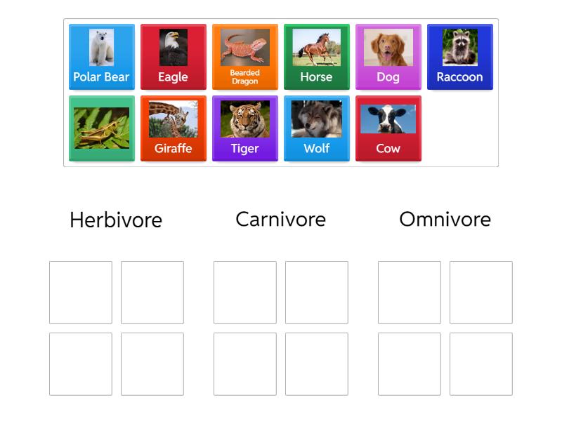 Herbivore: Giraffe, Horse, Cow, , Carnivore: Wolf, Tiger, Polar Bear, Eagle, Omnivore: Dog, Bearded Dragon, Raccoon,