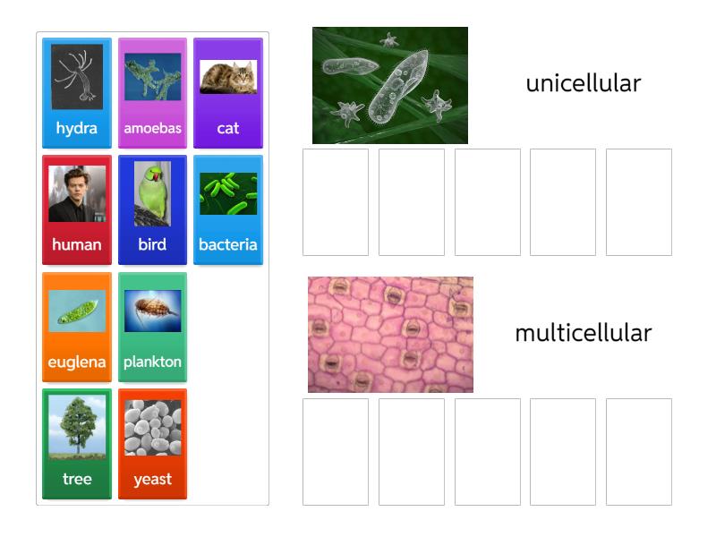 unicellular: yeast, bacteria, amoebas, plankton, euglena, multicellular: human, bird, cat, hydra, tree,