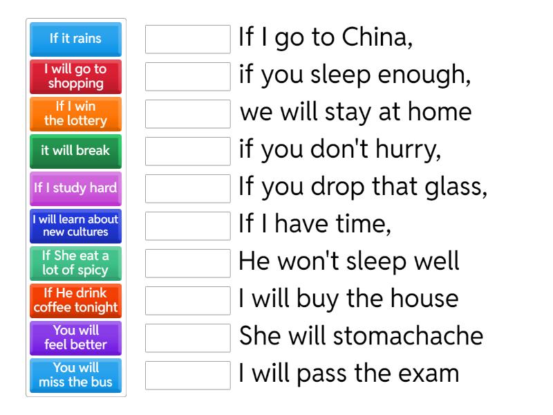 If I study hard - I will pass the exam, If it rains - we will stay at home, If I win the lottery - I will buy the house, If She eat a lot of spicy - She will stomachache, If He drink coffee tonight - He won't sleep well, You will miss the bus - if you don't hurry,, it will break - If you drop that glass,, I will go to shopping  - If I have time,, You will feel better - if you sleep enough,, I will learn about new cultures - If I go to China,,