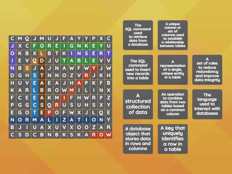 table - A database object that stores data in rows and columns, join - An operation to combine data from two tables based on a common column, primary - A key that uniquely identifies a row in a table, select - The SQL command used to retrieve data from a database, database - A structured collection of data, normalization - A set of rules to reduce redundancy and improve data integrity, sql - The language used to interact with databases, foreignkey - A unique column or set of columns used to establish a relationship between tables, insert - The SQL command used to insert new records into a table, row - A representation of a single, unique entity in a table,