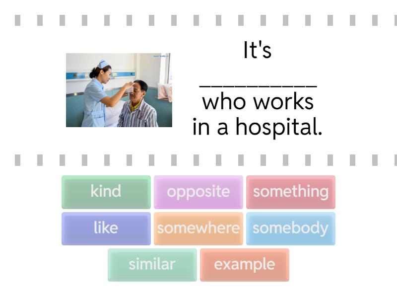 somebody - It's __________ who works in a hospital., something - It's __________ we use for everything nowadays., somewhere - It's __________ where people go when they want to buy something., kind - It's a __________ of gadget., opposite - It's the __________ of dark., like - It's __________ light, but you use it to describe hair., similar - It's __________ to intelligent., example - For __________, you do this to the TV.,