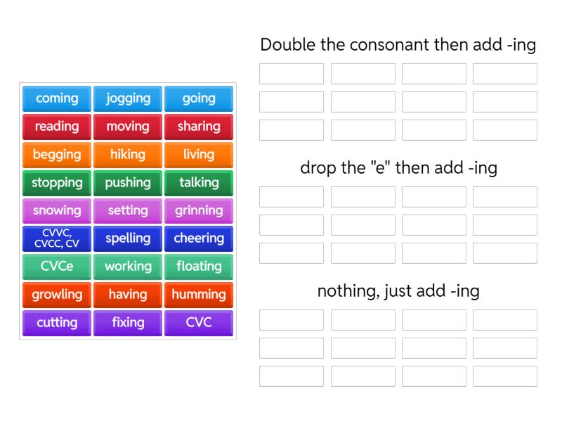 Double the consonant then add -ing: setting, cutting, stopping, begging, grinning, jogging, humming, CVC, drop the "e" then add -ing: hiking, moving, living, coming, having, sharing, CVCe, nothing, just add -ing: reading, cheering, spelling, floating, growling, talking, pushing, fixing, working, going, snowing, CVVC, CVCC, CV,