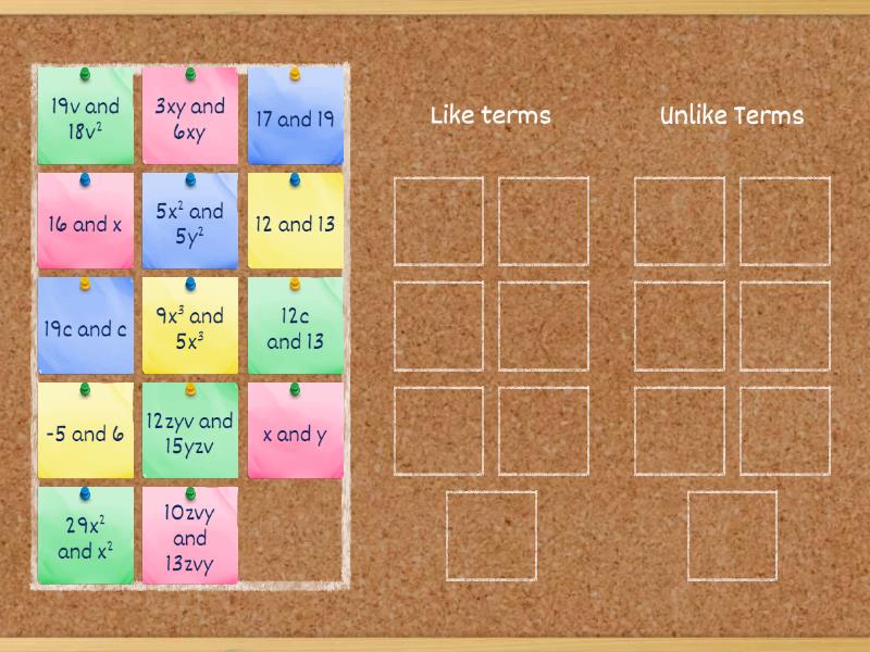 Like terms : 9x3 and 5x3, 3xy and 6xy, 17 and 19, 29x2 and x2, 10zvy and 13zvy, 19c and c, 12 and 13, Unlike Terms : x and y, 12c and 13, 5x2 and 5y2, -5 and 6, 12zyv and 15yzv, 16 and x, 19v and 18v2,