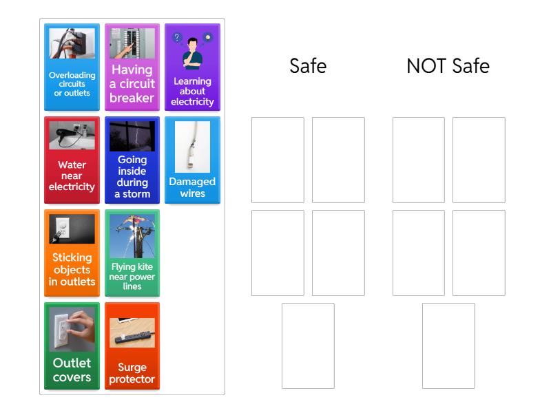 Safe: Surge protector, Outlet covers, Having a circuit breaker, Going inside during a storm, Learning about electricity, NOT Safe: Damaged wires, Sticking objects in outlets, Overloading circuits or outlets, Water near electricity, Flying kite near power lines,