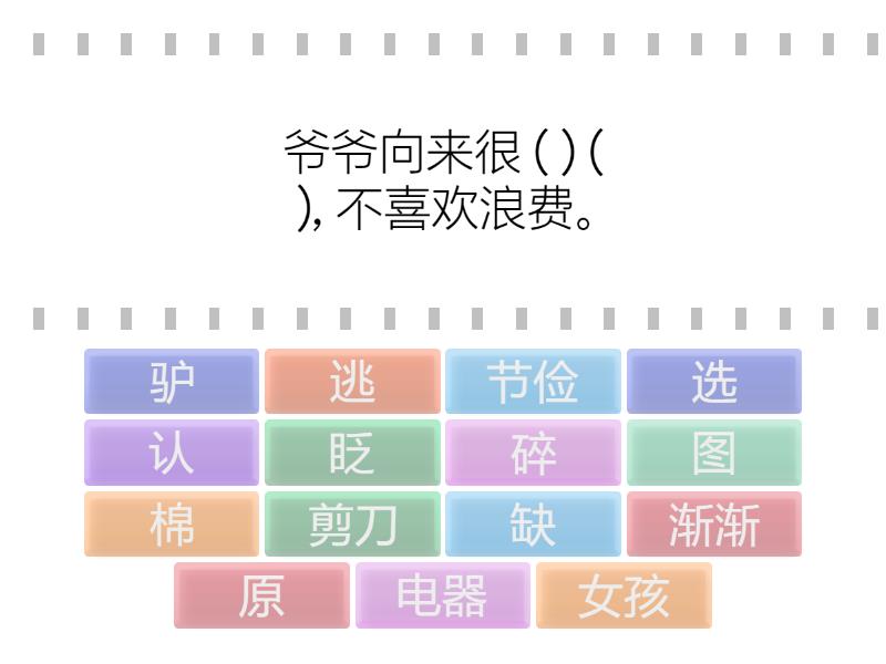 节俭 - 爷爷向来很 ( ) ( ), 不喜欢浪费。, 渐渐 - 天暗了,路上的行人 ( ) ( ) 少了。, 女孩 - 那 ( ) ( ) 儿的头发又浓又密。, 剪刀 - 奶奶拿起 ( ) ( ),细心地为我裁裤子。, 电器 - 损坏的 ( ) ( ) 经丽丽的巧手一修,又能重新使用。, 选 - 挑 ( ), 图 - ( ) 钉, 逃 - ( ) 避, 认 - 承 ( ), 缺 - ( ) 水, 原 - ( ) 始, 棉 - ( ) 布, 眨 - ( ) 眼睛, 碎 - 破 ( ), 驴 - ( ) 子,