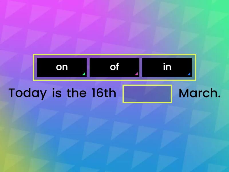 Today is the 16th ____ March. My mum’s birthday is ____ the 10th ____ August. Children go to school ____ the 1st ____ September. Helen’s birthday is ____ the 23rd ____ June. What day is the thirtieth ____ October? What’s the weather like ____ April? We have English ____ Monday. Do children have holidays ____ spring? They usually have a party ____ the 31st ____ May.