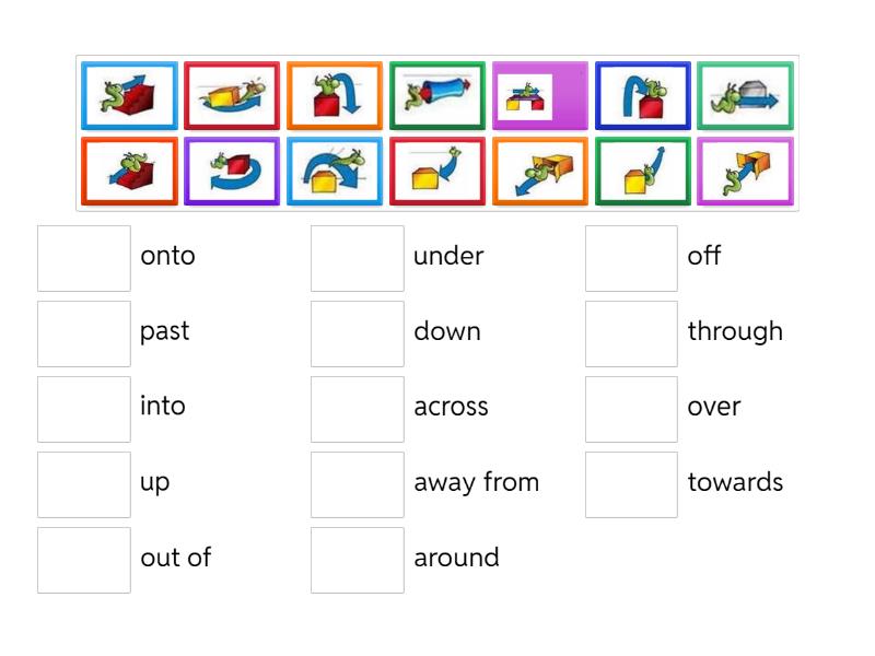 across, around, away from, down, into, off, onto, out of, over, past, through, towards, under, up,