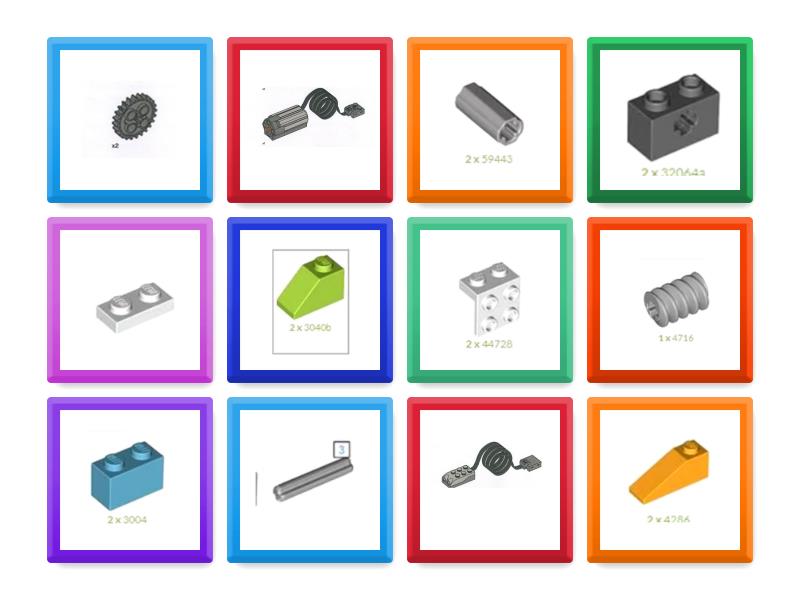 Кирпичик 1x2, Уголок 2x2 , Балка с поперечным отверстием, Ось, Кирпичик для перекрытия 1x2, Втулка удлинитель оси двухмодульная, Кирпичик для перекрытия 1x3, Пластина 1x2, Датчик движения, Мотор, Зубчатое колесо, Червячное колесо,
