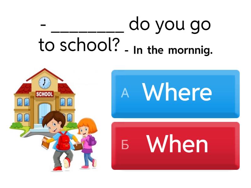 1) - ________ do you go to school? - In the mornnig. a) Where b) When 2) - ________ is it? - It's my phone. a) What b) When 3) - _________ do you have a shower? - In the evening. a) Where b) When 4) - ________ do you eat? - In the kitchen. a) Where b) When 5) - ________ do you study? - At school. a) Where b) When 6) - _________ do you have lunch? - In the afternoon. a) When b) Where 7) - _________ do you do in the bathroom? - I brush my teeth. a) What b) Where 8) - _________ do you play with your friends? - In the afternoon. a) When b) Where 9) - _________ do you have for breakfast? - I have cheese sandwich. a) Where b) What