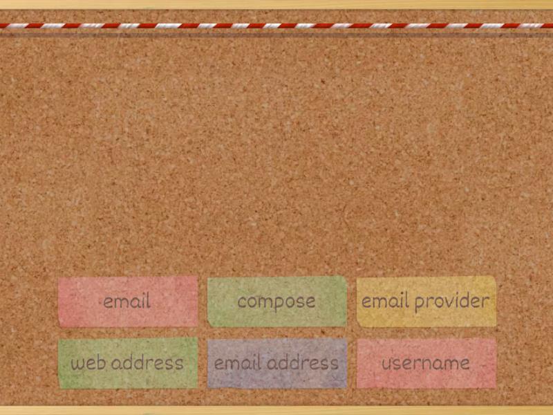 compose - To write or create a new email., email - A message you send through the internet., email address - A special name for your email., email provider - A company that lets you send and receive emails., web address - The address of a specific page or website on the internet., username - A name you choose to enter a computer, email, or website.,