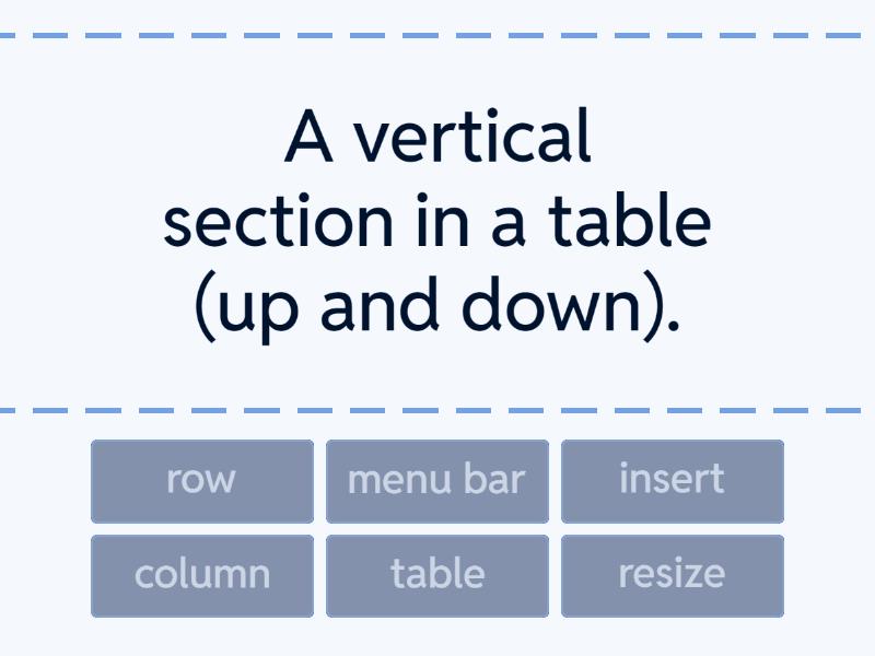 column - A vertical section in a table (up and down)., insert - To add something, like a picture, table, or link., menu bar - The row at the top of the screen with options like File, Edit, or View., resize - To make something bigger or smaller., row - A horizontal section in a table (left to right)., table - A grid of rows and columns to organize information.,