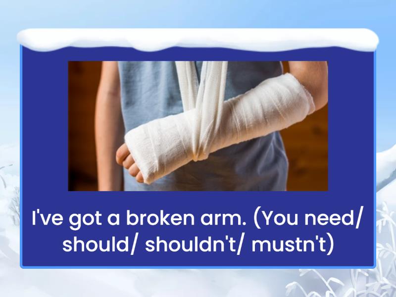 My head hurts. (You need/ should/ shouldn't/ mustn't), I've got an earache. (You need/ should/ shouldn't/ mustn't), I've got a stomachache. (You need/ should/ shouldn't/ mustn't), I've got a toothache. (You need/ should/ shouldn't/ mustn't), I've got a cough. (You need/ should/ shouldn't/ mustn't), I've got a flu. (You need/ should/ shouldn't/ mustn't), I've got a broken arm. (You need/ should/ shouldn't/ mustn't),