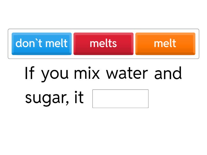 If you mix water and sugar, it ____ If you ____ ice, it melts If you heat water to 100 degrees Celsius, it ____. If I don`t drink coffee, I ____ tired. If you breathe in helium, your voice ____. If I don`t put on make up, I ____ anywhere. If it ____ , the ground is wet