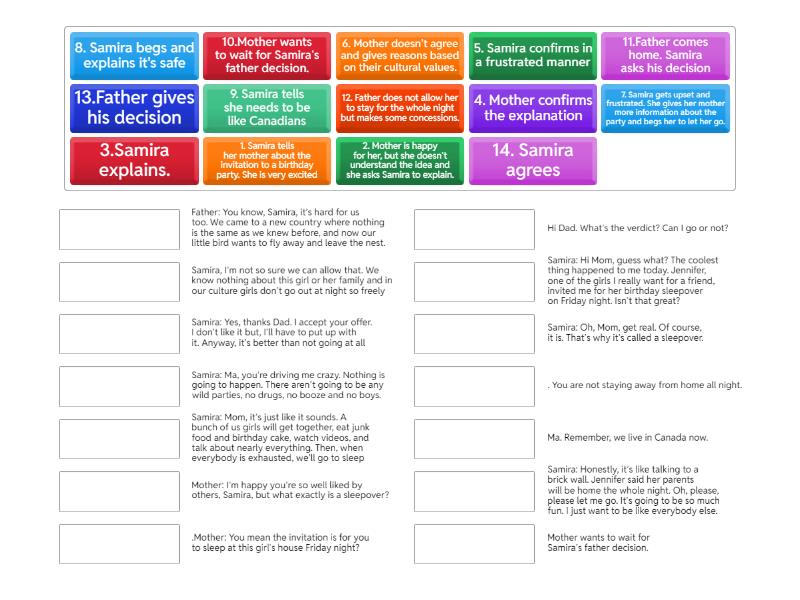 1. Samira tells her mother about the invitation to a birthday party. She is very excited - Samira: Hi Mom, guess what? The coolest thing happened to me today. Jennifer, one of the girls I really want for a friend, invited me for her birthday sleepover on Friday night. Isn’t that great?, 2. Mother is happy for her, but she doesn’t understand the idea and she asks Samira to explain. - Mother: I’m happy you’re so well liked by others, Samira, but what exactly is a sleepover?, 3.Samira explains. - Samira: Mom, it’s just like it sounds. A bunch of us girls will get together, eat junk food and birthday cake, watch videos, and talk about nearly everything. Then, when everybody is exhausted, we’ll go to sleep, 4. Mother confirms the explanation - .Mother: You mean the invitation is for you to sleep at this girl’s house Friday night?, 5. Samira confirms in a frustrated manner - Samira: Oh, Mom, get real. Of course, it is. That’s why it’s called a sleepover., 6. Mother doesn’t agree and gives reasons based on their cultural values. - Samira, I’m not so sure we can allow that. We know nothing about this girl or her family and in our culture girls don’t go out at night so freely, 7. Samira gets upset and frustrated. She gives her mother more information about the party and begs her to let her go. - Samira: Ma, you’re driving me crazy. Nothing is going to happen. There aren’t going to be any wild parties, no drugs, no booze and no boys., 8. Samira begs and explains it's safe - Samira: Honestly, it’s like talking to a brick wall. Jennifer said her parents will be home the whole night. Oh, please, please let me go. It’s going to be so much fun. I just want to be like everybody else., 9. Samira tells she needs to be like Canadians - Ma. Remember, we live in Canada now., 10.Mother wants to wait for Samira’s father decision. - Mother wants to wait for Samira’s father decision., 11.Father comes home. Samira asks his decision - Hi Dad. What’s the verdict? Can I go or not?, 12. Father does not allow her to stay for the whole night but makes some concessions. - Father: You know, Samira, it’s hard for us too. We came to a new country where nothing is the same as we knew before, and now our little bird wants to fly away and leave the nest., 13.Father gives his decision - . You are not staying away from home all night., 14. Samira agrees - Samira: Yes, thanks Dad. I accept your offer. I don’t like it but, I’ll have to put up with it. Anyway, it’s better than not going at all,