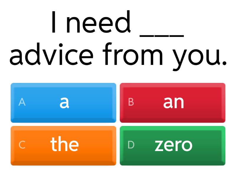 1) I need ___ advice from you. a) a b) an c) the d) zero  2) ________water in the glass is cold. a) a b) an c) the d) zero  3) ___ Mount Everest is the highest mountain in the world. a) a b) an c) the d) zero 4) ___ books on the shelf are all about history. a) a b) an c) the d) zero 5) He gave me________ interesting idea. a) a b) an c) the d) zero 6) ___ people often avoid making eye contact in certain situations. a) a b) an c) the d) zero 7) She lives in _______ small village near the sea. a) a b) an c) the d) zero  8) He is studying to become ___ engineer. a) a b) an c) the d) zero