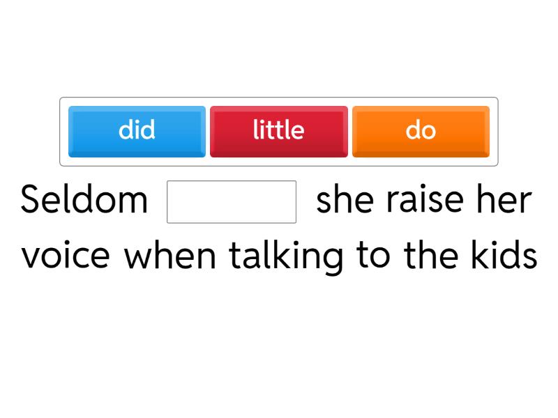 Seldom ____ she raise her voice when talking to the kids Rarely ____ I met anyone with such an enthusiasm. I hadn't met Maria before, and nor ____the other members of the committee ____ Maria threatened to withdraw her support ____ the council back down ____ has she ever ____payment for her education work She argued that ____ should children from poorer backgrounds be made to pay for music lessons ____ has she persuaded YCO members to give up their time, ____ she has ____ encouraged visiting musicians to give free concerts in schools ____ she ____ when she set up the project that it would be so influential ____ had Maria ____ walked through the door ____she started to talk about her proposal ____ you ____ further details, please contact our public information office ____ it not ____ for her perseverance, we would not be here today. Thank you! ____ the Brazilian president ____ a speech, he would say gibberish for sure. ____ taxes ____ any further, there would be a huge public outcry. ____ could I find my keys ____we invest money ____ the company Only now ____ how reckless I was Not once ____ at me at the party. ____ I was a child ____ so much fun at the party. In no way ____ to this awful person ____ ____ such great expressions of art. ____I sleep ____ about the accident. ____ in this book ____ I cannot cheat Only then ____ my error. ____ the meeting ____ he made the call Not until she arrived ____ anything ____ did I ____I would be offered the job, so I was amazed when I got it. ____ left the hotel ____it started to pour with rain. ____ ____such cruel behaviour by one child to another. 1. ____ Batman ____ come, we’re in big trouble. But don’t worry, he always comes. (mixed conditionals)2. ____they ____ us about the dolphin, we wouldn’t have come. ____ ____to Paris in the summer. It must be beautiful.