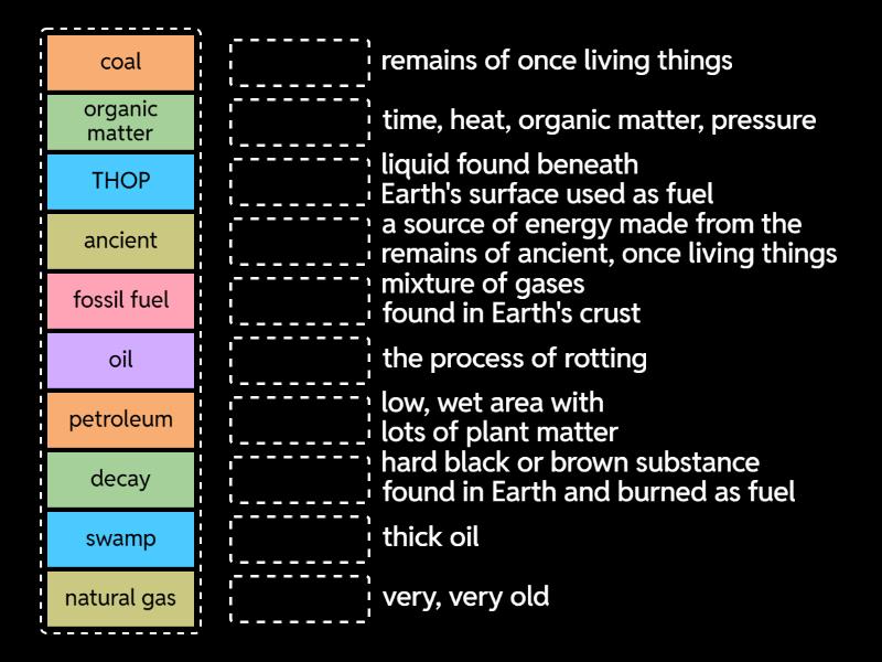 fossil fuel - a source of energy made from the remains of ancient, once living things, coal - hard black or brown substance found in Earth and burned as fuel, decay - the process of rotting, natural gas - mixture of gases found in Earth's crust, oil - liquid found beneath Earth's surface used as fuel, petroleum - thick oil , ancient - very, very old, swamp - low, wet area with lots of plant matter, organic matter - remains of once living things, THOP - time, heat, organic matter, pressure,