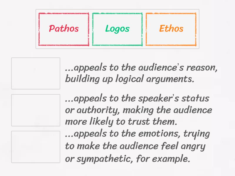Logos - ...appeals to the audience’s reason, building up logical arguments., Ethos - ...appeals to the speaker’s status or authority, making the audience more likely to trust them., Pathos - ...appeals to the emotions, trying to make the audience feel angry or sympathetic, for example.,