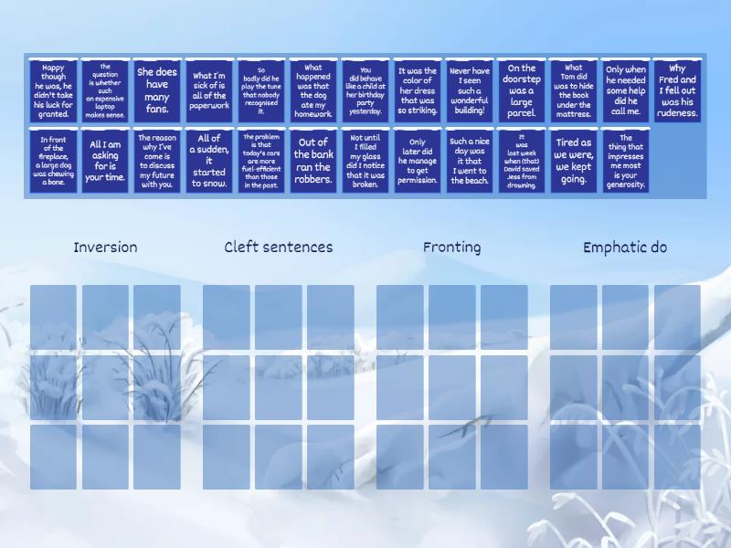 Inversion: Only later did he manage to get permission., So badly did he play the tune that nobody recognised it., Out of the bank ran the robbers., Such a nice day was it that I went to the beach., Only when he needed some help did he call me., Not until I filled my glass did I notice that it was broken., Never have I seen such a wonderful building!, On the doorstep was a large parcel., Cleft sentences: What Tom did was to hide the book under the mattress., What happened was that the dog ate my homework., It was the color of her dress that was so striking., It was last week when (that) David saved Jess from drowning., The reason why I’ve come is to discuss my future with you., What I’m sick of is all of the paperwork, Why Fred and I fell out was his rudeness., The thing that impresses me most is your generosity., All I am asking for is your time., Fronting: The question is whether such an expensive laptop makes sense., The problem is that today's cars are more fuel-efficient than those in the past., In front of the fireplace, a large dog was chewing a bone., Happy though he was, he didn't take his luck for granted., Tired as we were, we kept going., All of a sudden, it started to snow., Emphatic do: You did behave like a child at her birthday party yesterday., She does have many fans.,