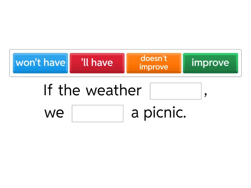 If the weather ____, we ____ a picnic. I ____ if you ____ with me. We____ if we ____. They____ on holiday if they ____. She____ dinner if you ____ to the supermarket. I____ a new dress if I ____ enough money. He ____ a better job if he ____ that exam. They____ to the party if they ____. If we ____ each other tomorrow, we____ each other next week. If we ____ on holiday this summer, we____ to Spain. If I ____ to bed early, I____ tired tomorrow.