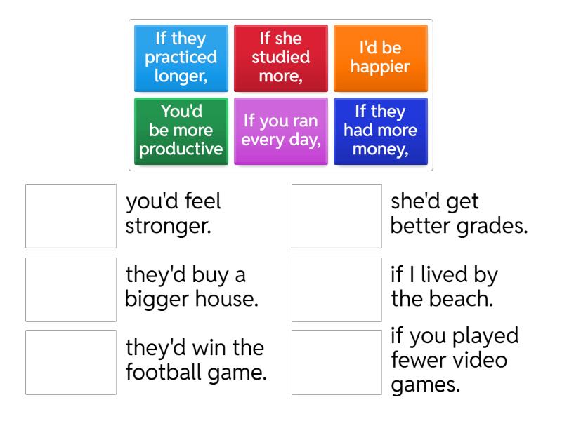If she studied more, - she'd get better grades. , I'd be happier - if I lived by the beach. , If they had more money, - they'd buy a bigger house. , If you ran every day, - you'd feel stronger., You'd be more productive - if you played fewer video games. , If they practiced longer, - they'd win the football game. ,