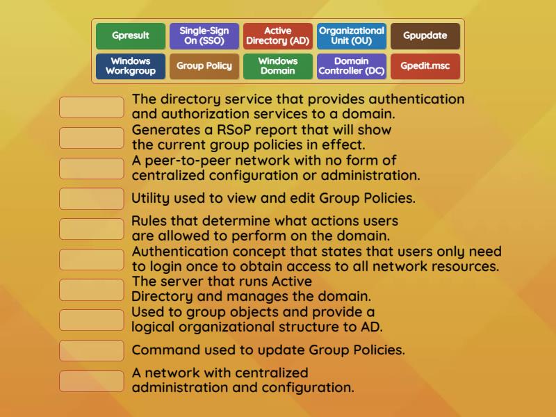 Windows Domain - A network with centralized administration and configuration., Windows Workgroup - A peer-to-peer network with no form of centralized configuration or administration. , Active Directory (AD) - The directory service that provides authentication and authorization services to a domain. , Group Policy - Rules that determine what actions users are allowed to perform on the domain. , Single-Sign On (SSO) - Authentication concept that states that users only need to login once to obtain access to all network resources. , Domain Controller (DC) - The server that runs Active Directory and manages the domain. , Gpupdate - Command used to update Group Policies. , Gpresult - Generates a RSoP report that will show the current group policies in effect. , Gpedit.msc - Utility used to view and edit Group Policies., Organizational Unit (OU) - Used to group objects and provide a logical organizational structure to AD. ,