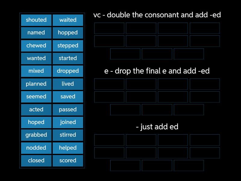 vc - double the consonant and add -ed: hopped, nodded, planned, grabbed, stirred, stepped, dropped, e - drop the final e and add -ed: hoped, closed, named, scored, lived, saved, - just add ed: joined, acted, waited, started, chewed, wanted, mixed, passed, helped, shouted, seemed,
