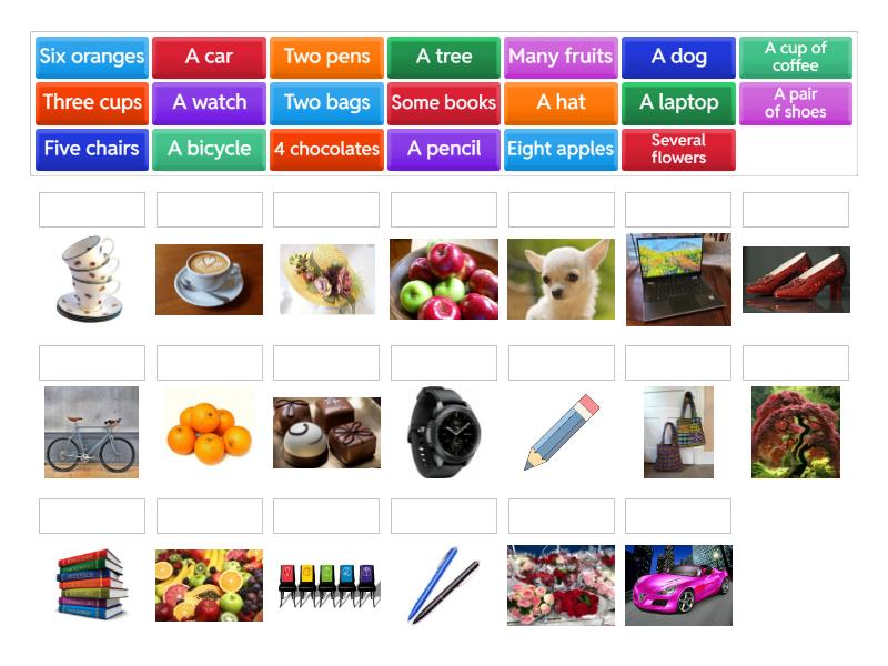 Many fruits, A dog, 4 chocolates, Some books, A car, Two pens, A hat, Several flowers, Three cups, A bicycle, Five chairs, A tree, A cup of coffee, Two bags, A laptop, A pencil, Eight apples, A pair of shoes, A watch, Six oranges,