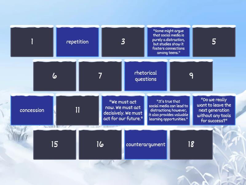 counterargument - "Some might argue that social media is purely a distraction, but studies show it fosters connections among teens.", concession - "It’s true that social media can lead to distractions; however, it also provides valuable learning opportunities.", rhetorical questions - "Do we really want to leave the next generation without any tools for success?", repetition - "We must act now. We must act decisively. We must act for our future.", parallelism - "We came, we saw, we conquered.", call-to-action - "Join the movement today and make a difference!", ethos - "As a doctor with 20 years of experience, I can assure you this treatment is safe.", pathos - "Think of the innocent children who suffer from hunger every day.", logos - "According to a recent study, 80% of consumers prefer eco-friendly products.",